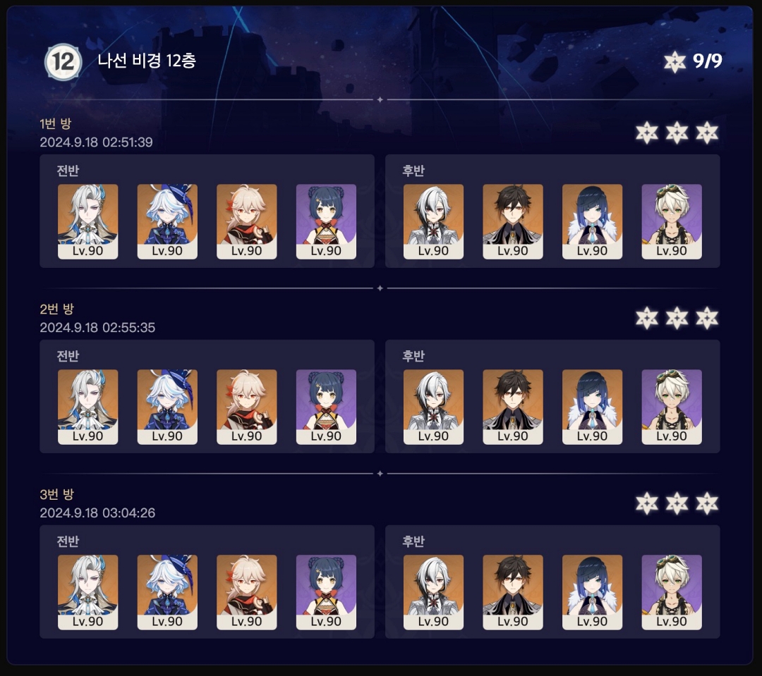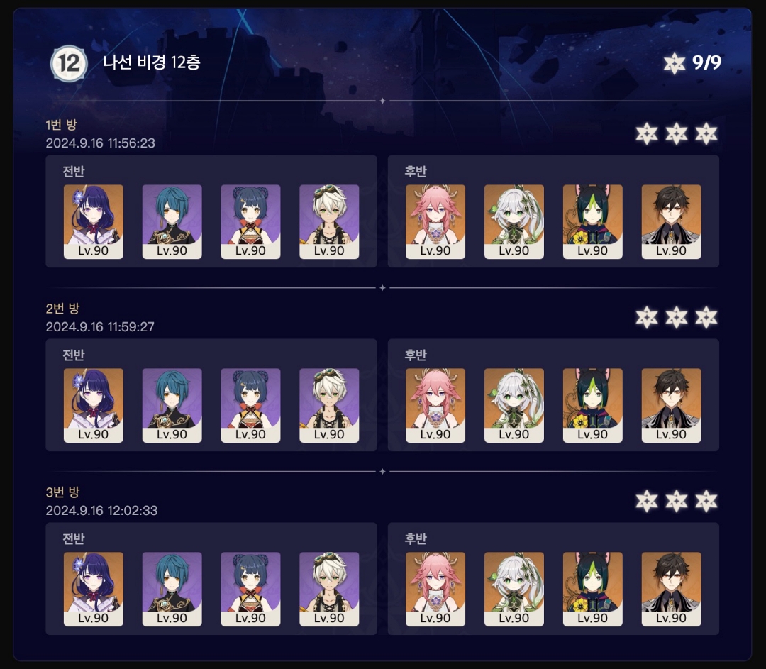 아래는 이번 나선비경 12층에서 유저들이 가장 많이 사용한 파티 조합입니다.