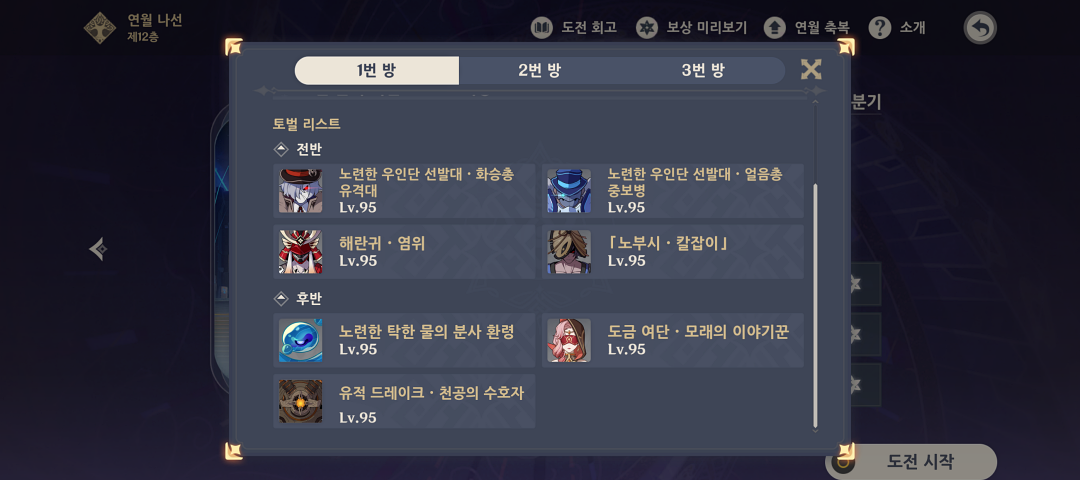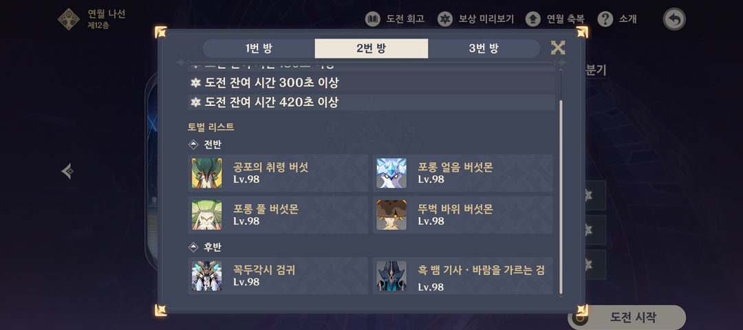이번 나선비경의 난이도는 그냥 적당한 수준으로 느껴지면 아래는 제가 클리어한 12층 파티입니다.
