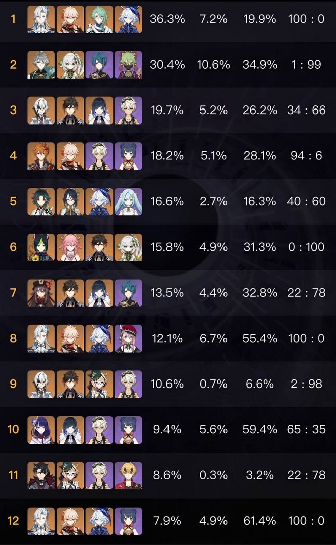 아래는 중국의 위챗 통계로 보유율 대비 픽률로 키니치는 이번 나선 1층에서 후반에 사용하면 괜찮은데 픽업을 시작한지 얼마 되지 않아서 아직 통계에는 나오지 않습니다.