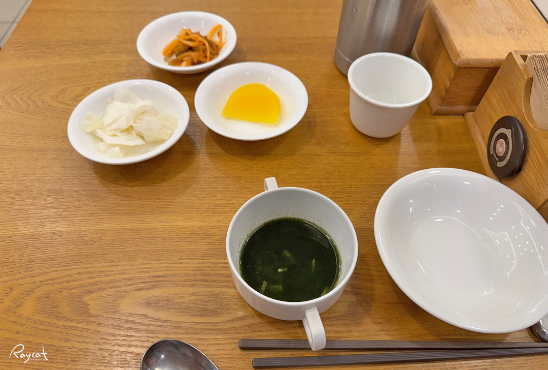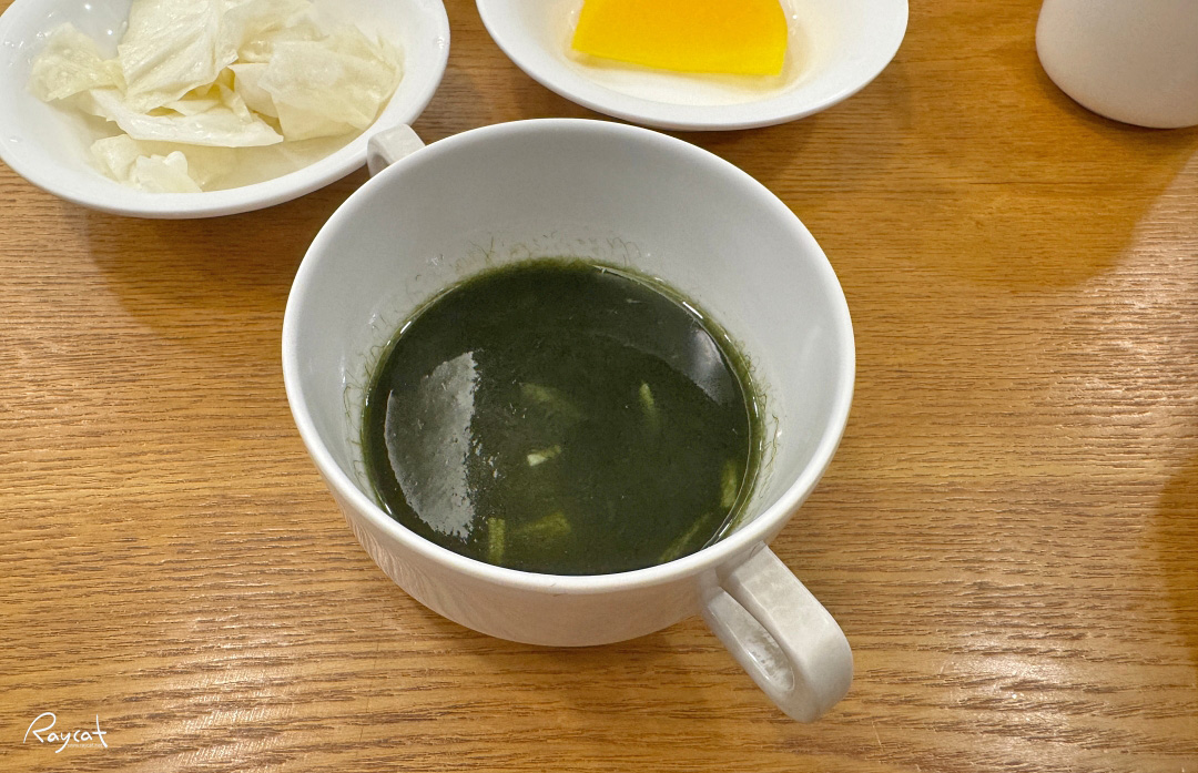 비가 와서 짬뽕 생각이 나서 뚝배기 알짬뽕을 주문하고 기다리니 바로 짜사이, 단무지, 양배추와 매생이 수프가 나온다.