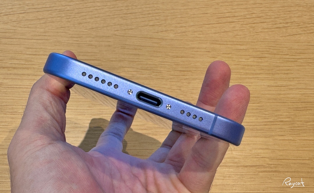 하단부에 USB-C 충전 포트와 스피커와 마이크가 있으며 아이폰16 일반 모델의 USB-C는 3.0이 아닌 USB 2 규격이라 유선 연결시 프로 시리즈 보다 데이터 전송 속도는 느립니다.