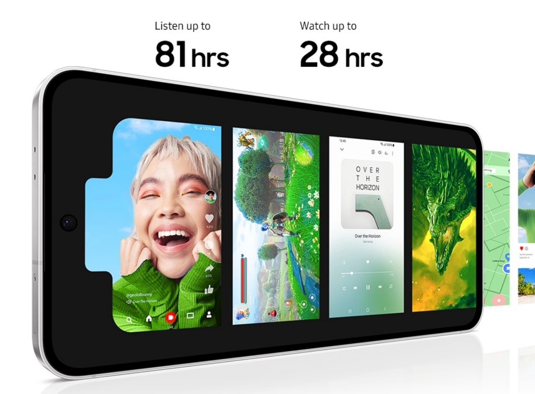 기타 : 갤럭시 AI, 유선 충전 25W, 3A USB-C 케이블 사용 시 약 30분 만에 최대 50% 충전, 고속 무선 충전, 무선 배터리 공유