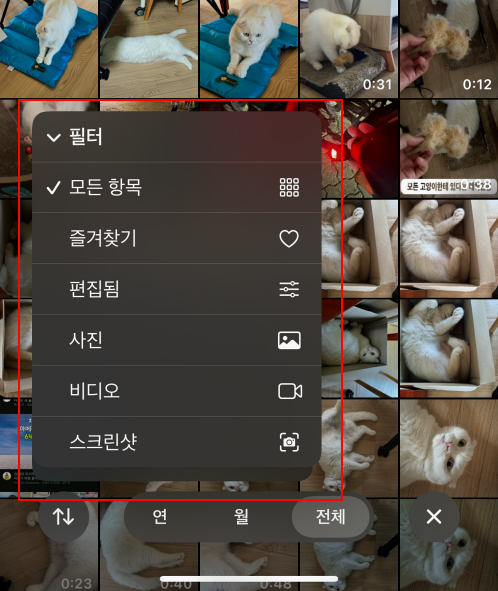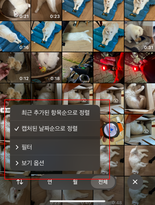 아이폰 저장공간에 쌓인 사진과 영상이 많을수록 예전 사진을 찾기 힘들어지는데 정렬순에서 옵션으로 사진과 영상을 구분하거나 아이폰에서 편집한 사진만 따로 모아서 볼 수 있습니다.