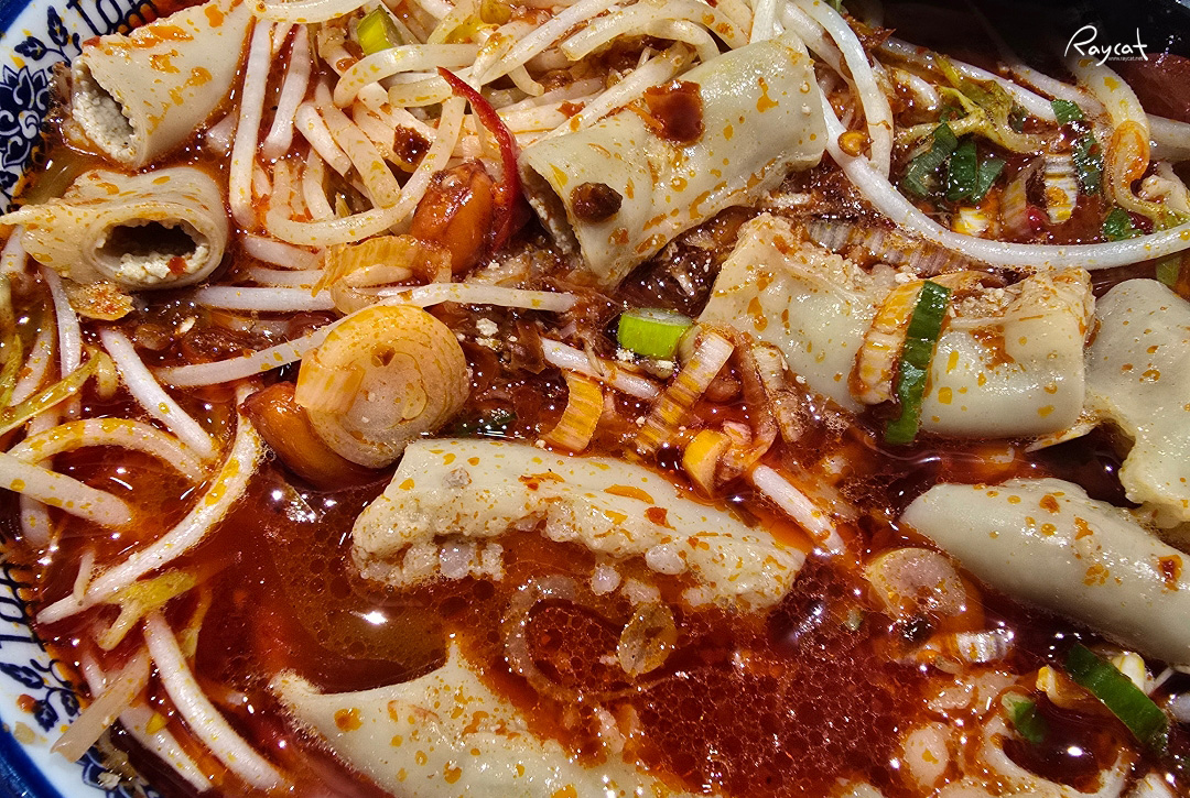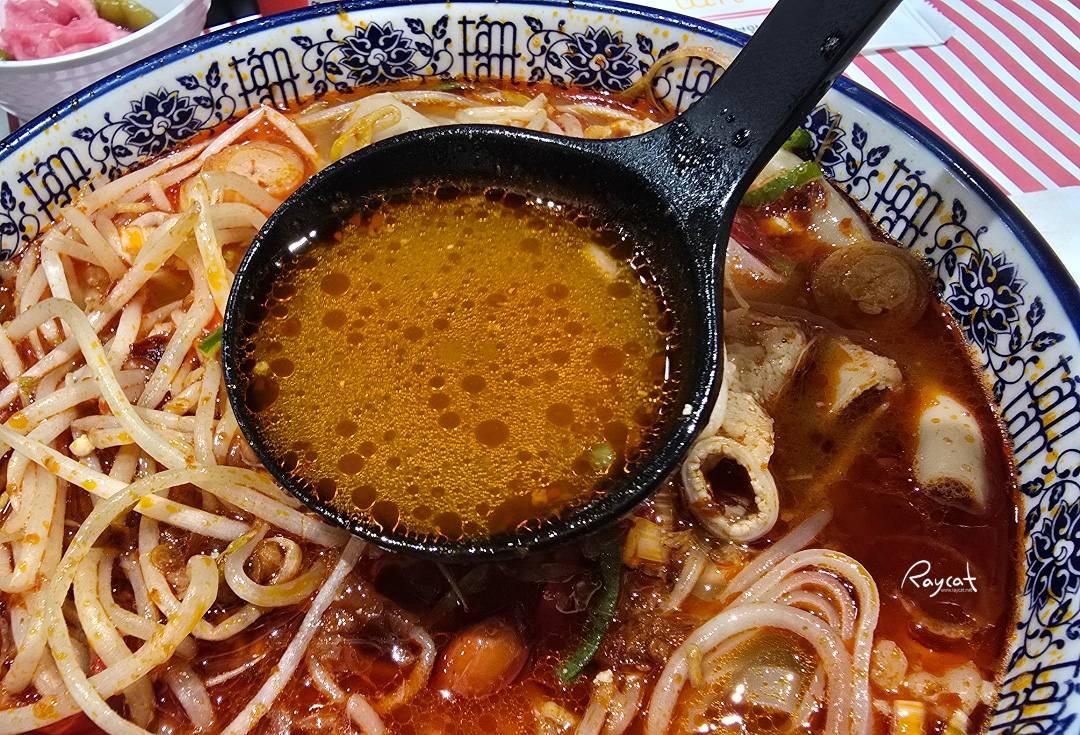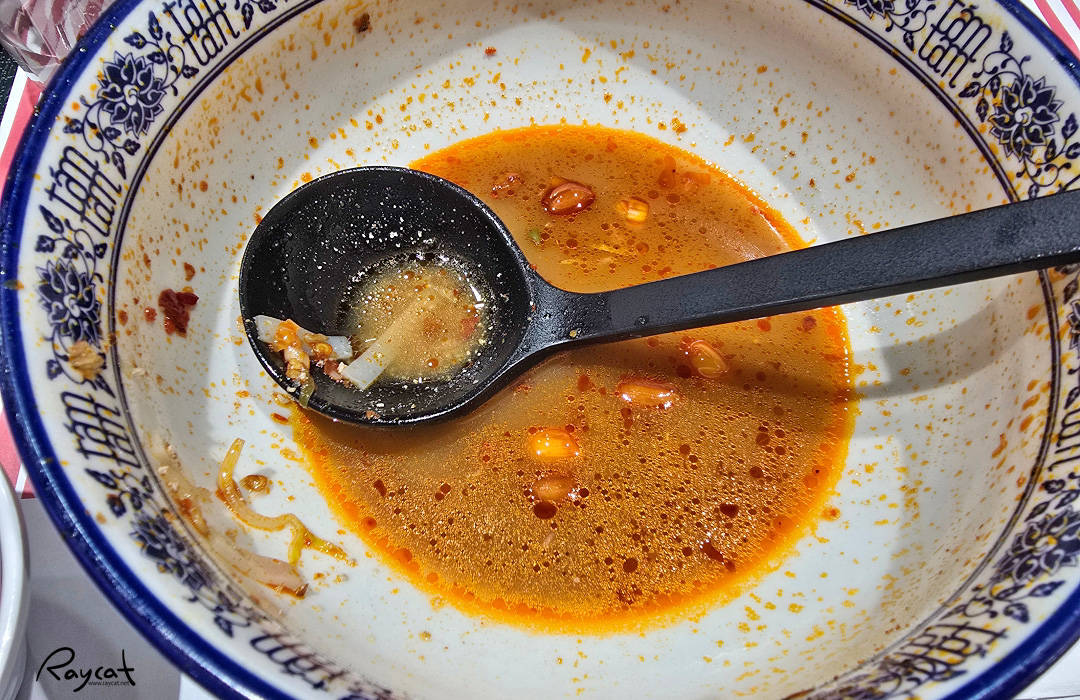 그리고 국물이 정말 진한데 매운 베트남식 쌀국수에 튼실한 곱창을 넣은 느낌인데 국물의 향이 일단 매워서 한국자 먹어보니 국물의 맛은 매운맛의 베트남 쌀국수로 2단계가 신라면 맵기 정도라는데 실제 그것보다 조금 더 맵게 느껴진다.