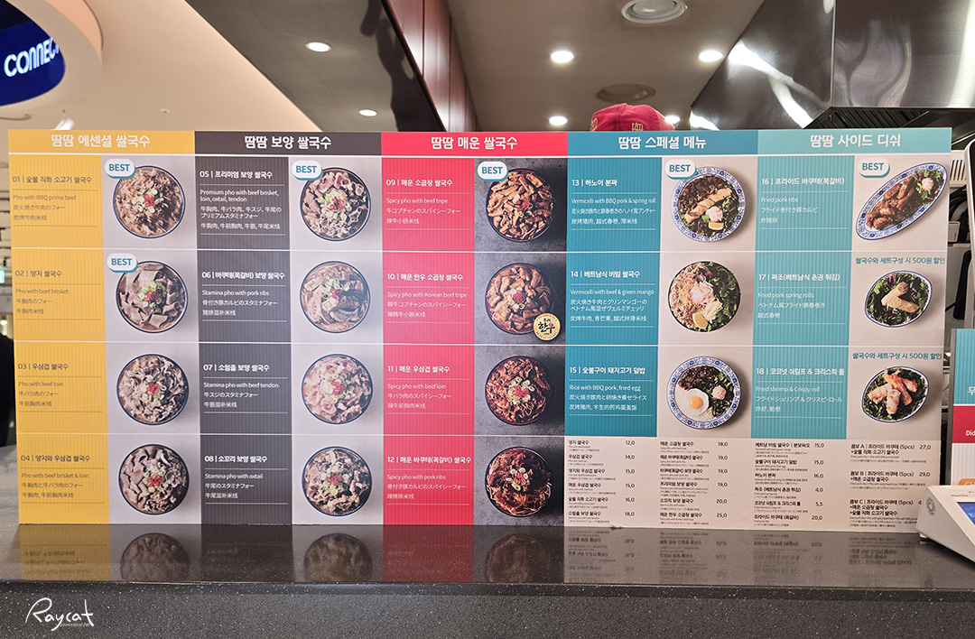 메뉴판에 보면 베스트라고 표시된 쌀국수들이 '땀땀'의 대표 메뉴로 매운맛을 좋아하면 매운 쌀국수, 보양 쌀국수는 이름 그대로 보양식이며 에센셜 쌀국수는 양지와 우삼겹이 들어가 있는데 국수마다 소고기의 부위가 좀 다르게 들어간다.