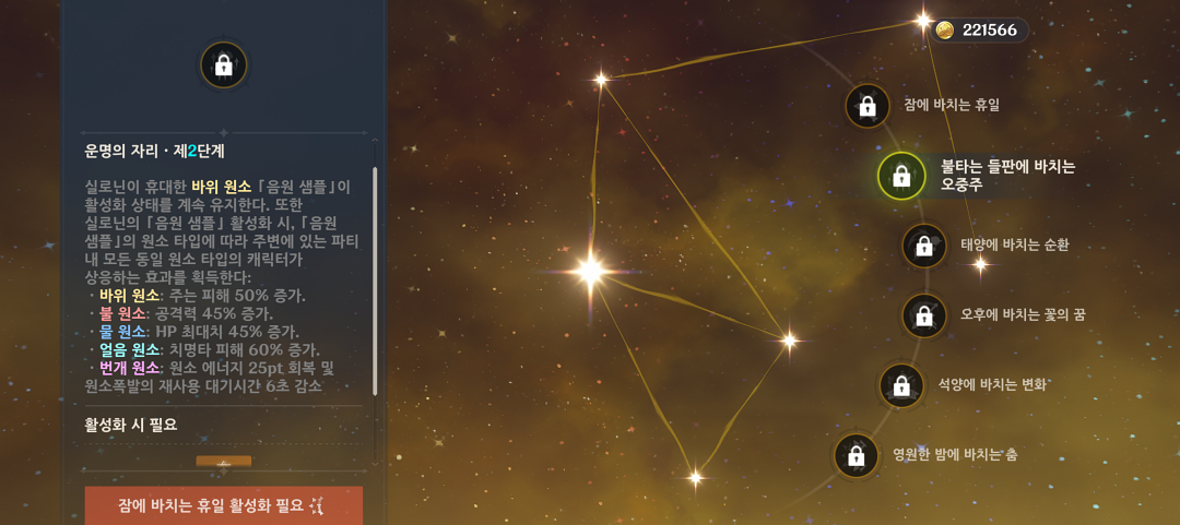 돌파의 경우 1돌파는 경직저항 0.5가 있으며 2돌파가 핵심으로 바위, 불, 물, 얼음, 번개 원소마다 상당한 버프를 주는데 2돌파의 경우 파티 내에 해당 원소 캐릭터가 받는 버프는 거의 성유물 하나 이상의 옵션으로 볼 수 있습니다.