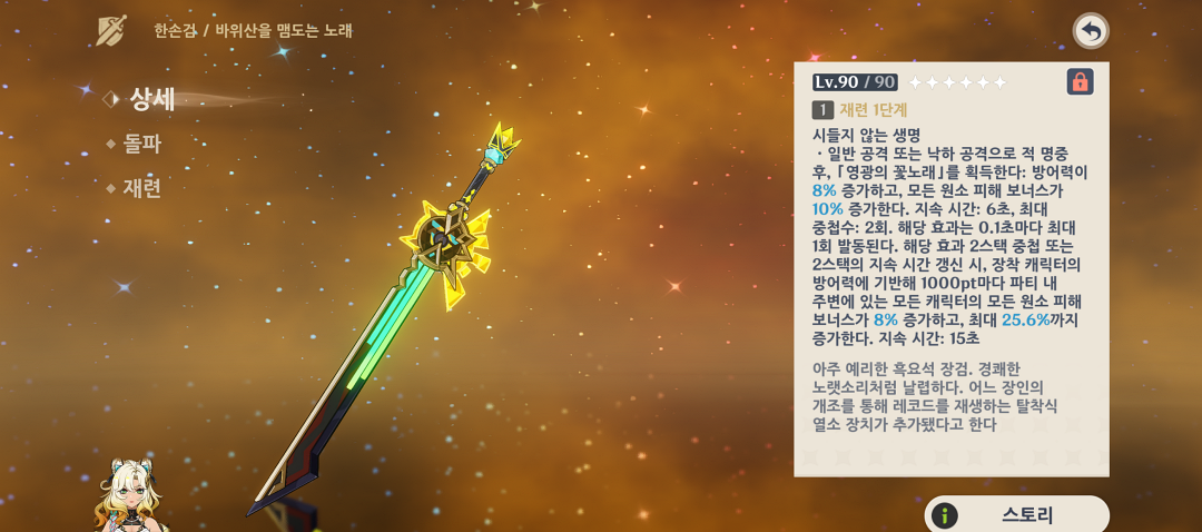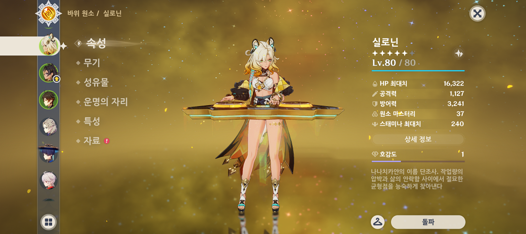 지금 실로닌은 80렙 돌파이며 전용 무기는 90렙까지 올렸는데 특성에 들어가는 모라를 계산 안 해서 지금 모라가 없어서 90렙으로 올리지 못하고 돌파만 한 상태입니다.