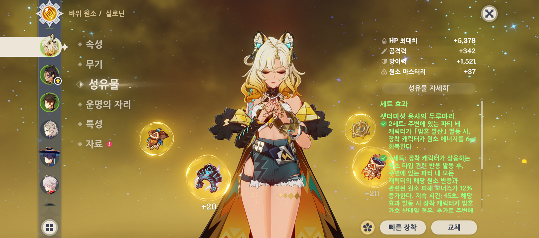 방어력 성유물은 많이 쌓이기 때문에 성유물 세트를 만드는데 난이도는 낮은 편입니다.