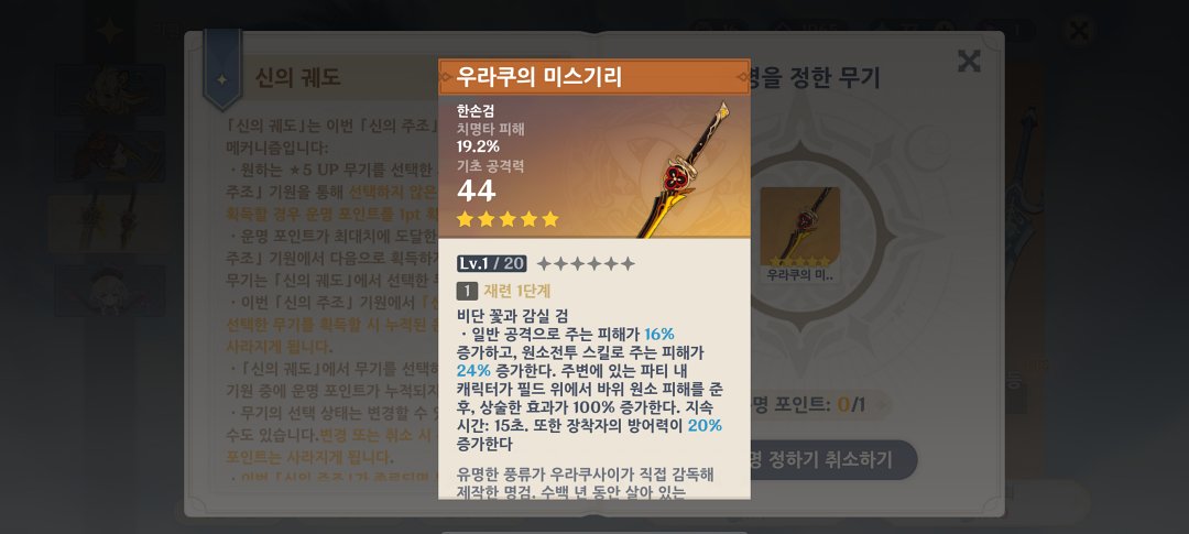 그리고 이번 전반부 픽업에 치오리의 전용 무기인 '우라쿠의 미스기리'도 범용성이 좋은 무기로 일반 공격으로 딜을 하는 각청이나 아야토 같은 한손검 딜러면 대부분 활용할 수 있습니다.