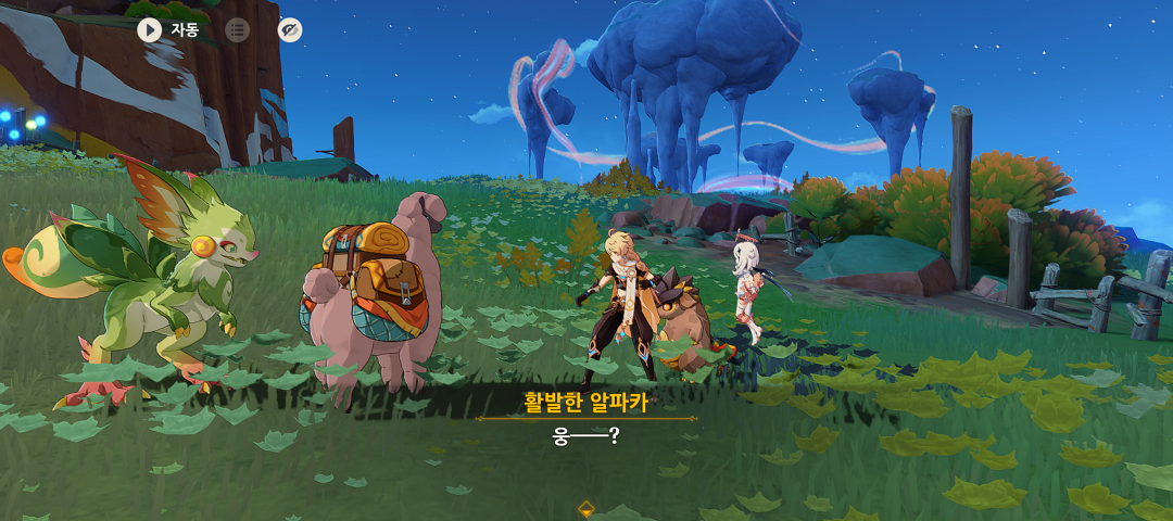친구 만들기에 실패하고 주변을 보면 절벽 끝쪽에 산룡이 보이는데 꼬마 산룡이 있는 곳으로 달려가면 '겁 많은 알파카'를 볼 수 있습니다.