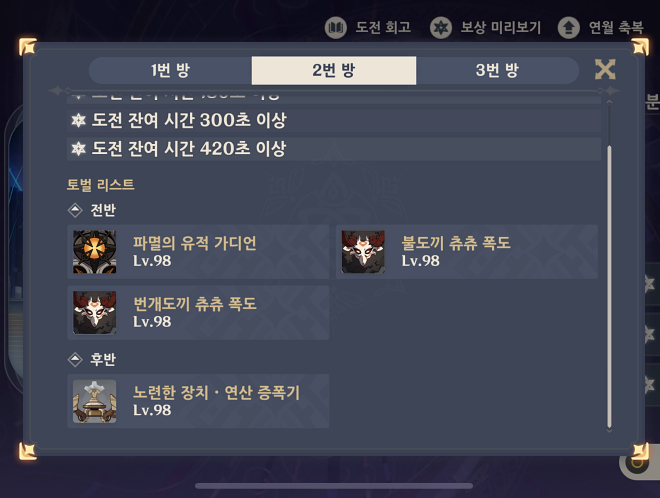 몹 배치를 보면 후반부는 바위 원소가 필요하고 전반은 물이나 불, 번개 딜러를 중심으로 서포터를 넣으면 되는데 1번 방이 좀 까다로운 느낌이며 2,3번 방은 쉽게 클리어할 수 있습니다.