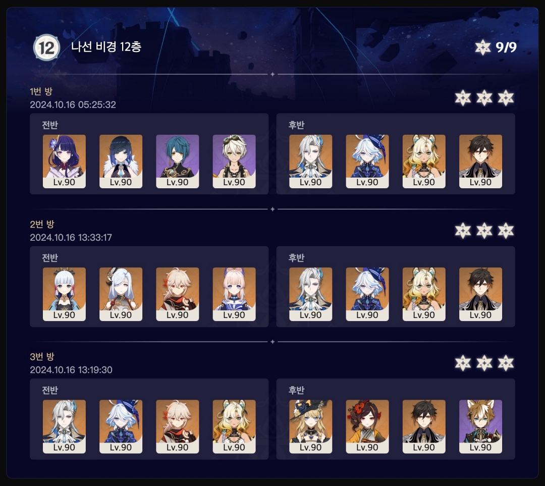 그리고 이번 나선비경은 5.0 버전에서 나선비경을 12층까지 36별로 클리어했다면 9층, 10층은 플레이하지 않아도 되기 때문에 더 편했던 것 같습니다.