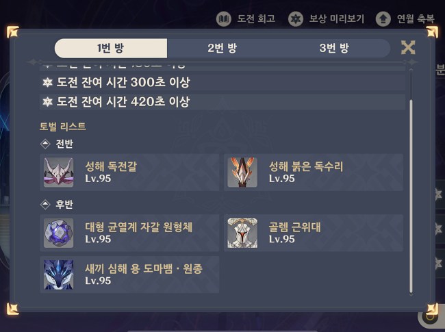 몹 배치를 보면 후반부는 바위 원소가 필요하고 전반은 물이나 불, 번개 딜러를 중심으로 서포터를 넣으면 되는데 1번 방이 좀 까다로운 느낌이며 2,3번 방은 쉽게 클리어할 수 있습니다.