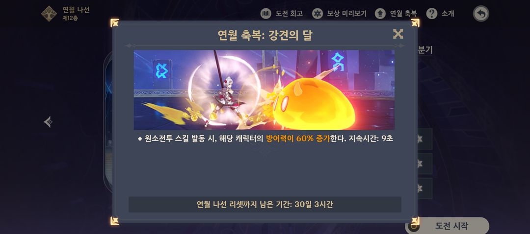 이번 나선비경 12층 버프는 원소전투 스킬 발동 시 방어력 60% 증가가 있습니다.