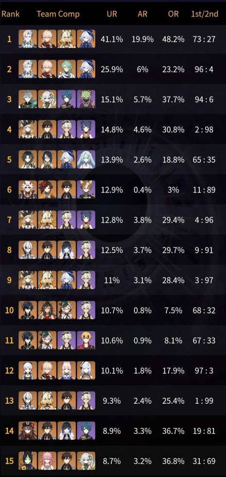 나선비경 업데이트가 10월 16일 이었고 10월 17일까지 이틀간 집계된 12층 픽률 데이터로 확실히 버프 때문에 바위 원소 캐릭터들이 모두 상위권으로 올라온 게 보입니다.