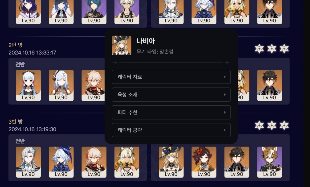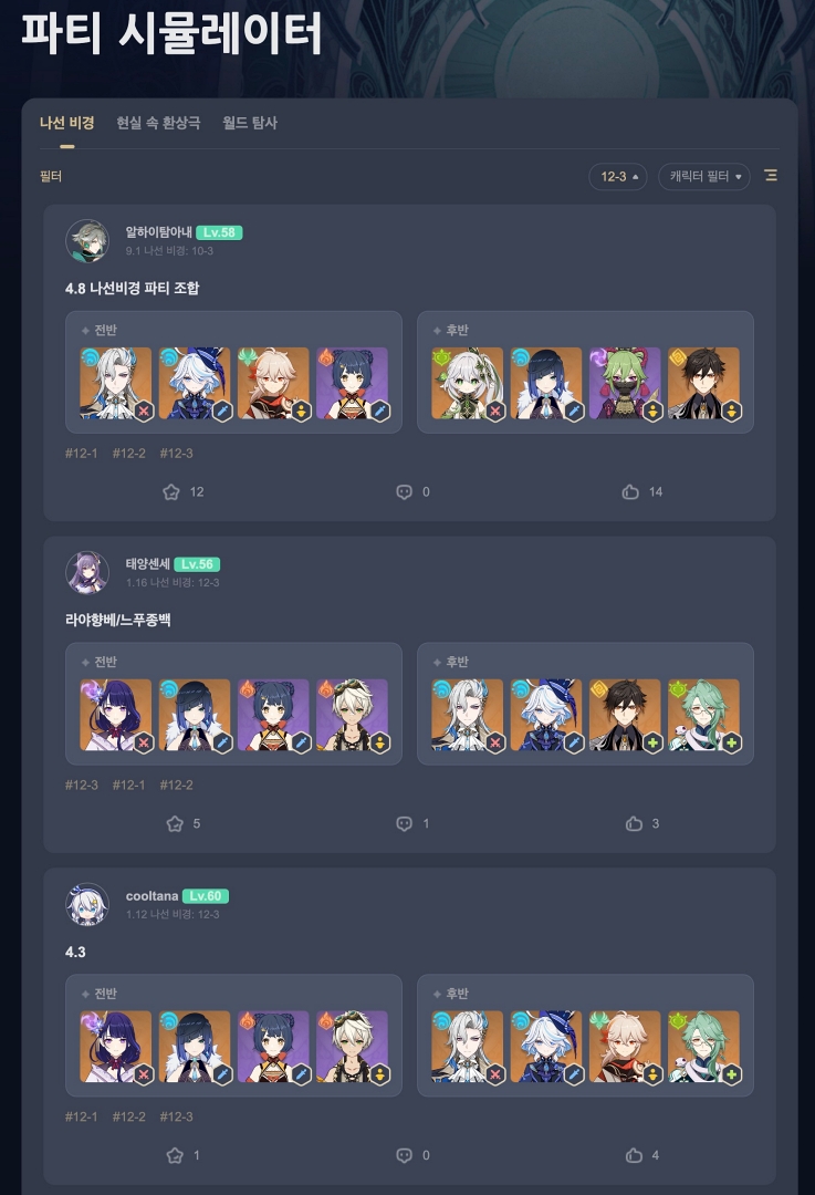 호요랩 전적 메뉴에서 파티 구성의 인원에서 캐릭터 선택 - 파티 추천을 누르면 파티 시뮬레이터가 나오며 다른 유저들이 나선비경이나 환상극, 월드 탐사에서 많이 구성한 파티들을 볼 수 있습니다.