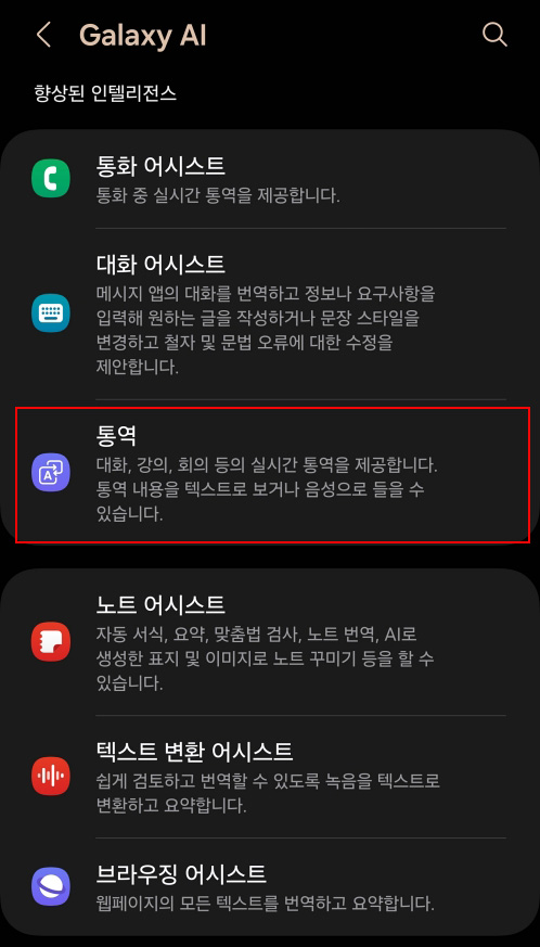 갤럭시 AI(Galaxy AI)에서 중간에 있는 통역을 탭 합니다.