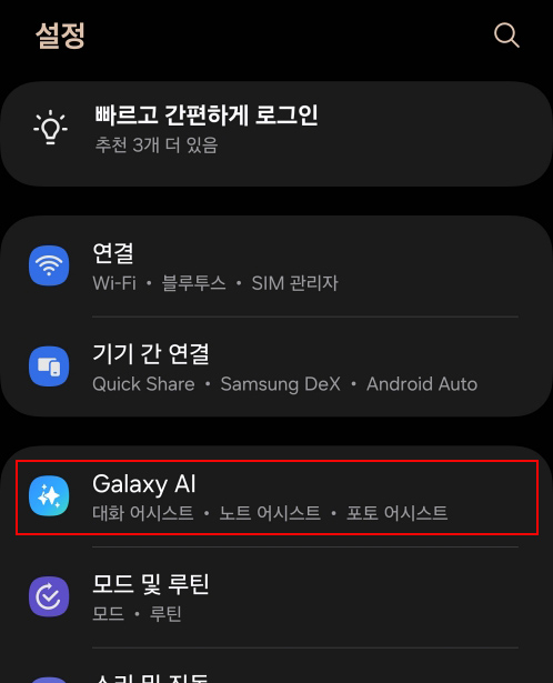 언어팩 다운로드를 하려면 설정에서 갤럭시 AI(Galaxy AI)를 탭 합니다.