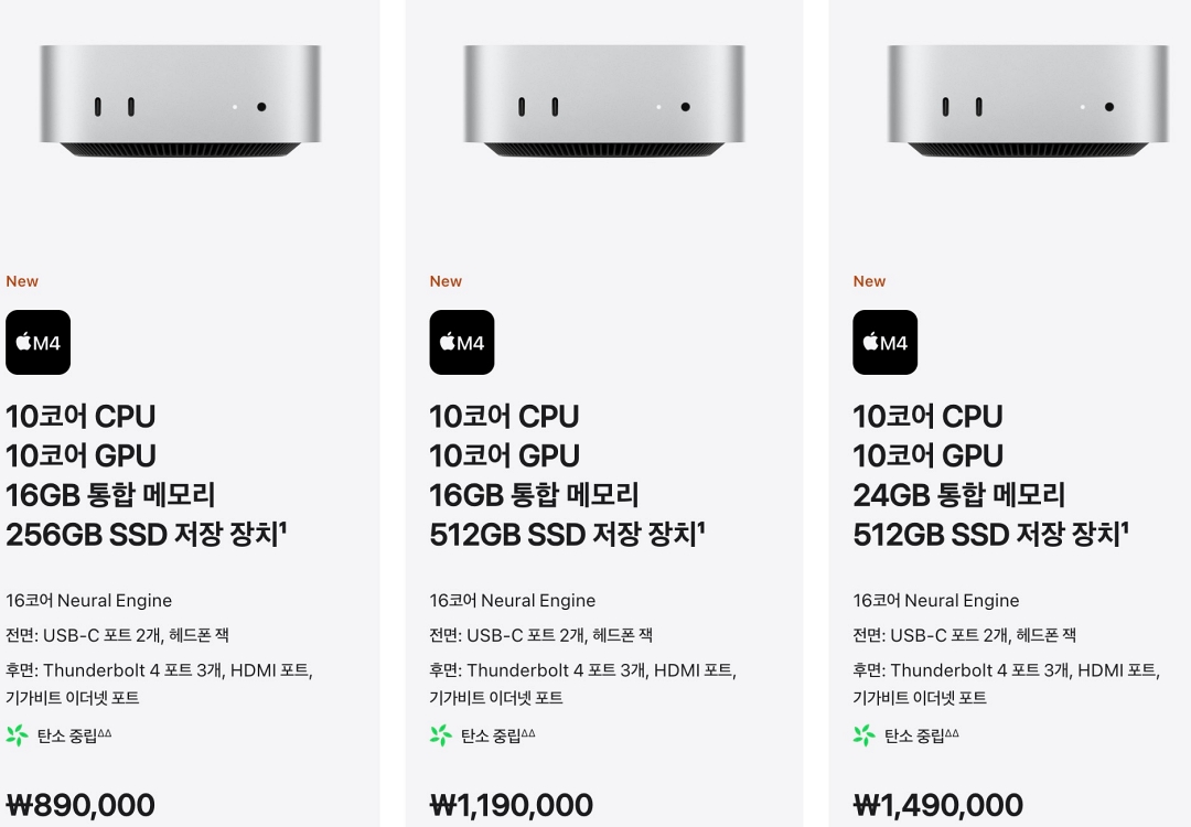 M4 칩을 탑재한 맥미니는 10 코어 CPU, 10코어 GPU를 갖추고 있으며, 16GB 통합 메모리부터 시작하며 M4 PRO 칩을 탑재한 맥미니는 12 코어 CPU, 16 코어 GPU, 24GB 통합 메모리를 사용하고 있습니다.