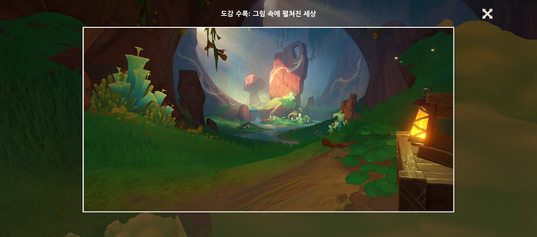 안쪽에 '불의 신 눈동자'와 진귀한 보물상자, 화려한 보물상자가 모두 있으니 아이템을 모두 획득하고 전경을 볼 수 있는 장소에 도감을 수록할 수 있으며 천지만물 업적 '그림 속으로....'가 끝납니다.