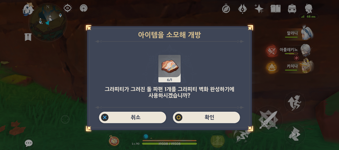 나타 필드를 돌아다니며 탐험도를 올리다 보면 임무 아이템으로 '그라피티가 그려진 돌 파편'을 획득할 수 있습니다.