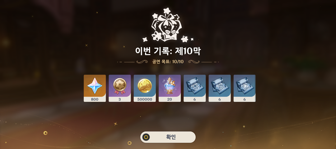 10막에서 제경우 라이덴, 호두, 리니, 콜레이를 썼는데 흔히 이야기하는 딜찍누로 클리어하며 별을 획득했습니다.