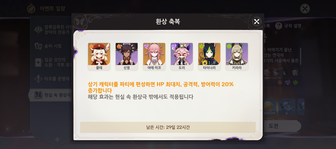 '현실 속 환상극'은 뒤로 갈수록 난이도가 높아지기 때문에 초반에 레벨이 낮은 캐릭터나 체험 캐릭터로 먼저 플레이하고 후반부에 축복을 활용해 조연을 빌리거나 본인이 잘 키운 캐릭터로 플레이하는 게 플레이 시간을 줄일 수 있습니다.