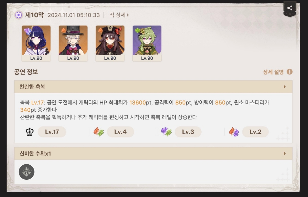 10막에서 제경우 라이덴, 호두, 리니, 콜레이를 썼는데 흔히 이야기하는 딜찍누로 클리어하며 별을 획득했습니다.