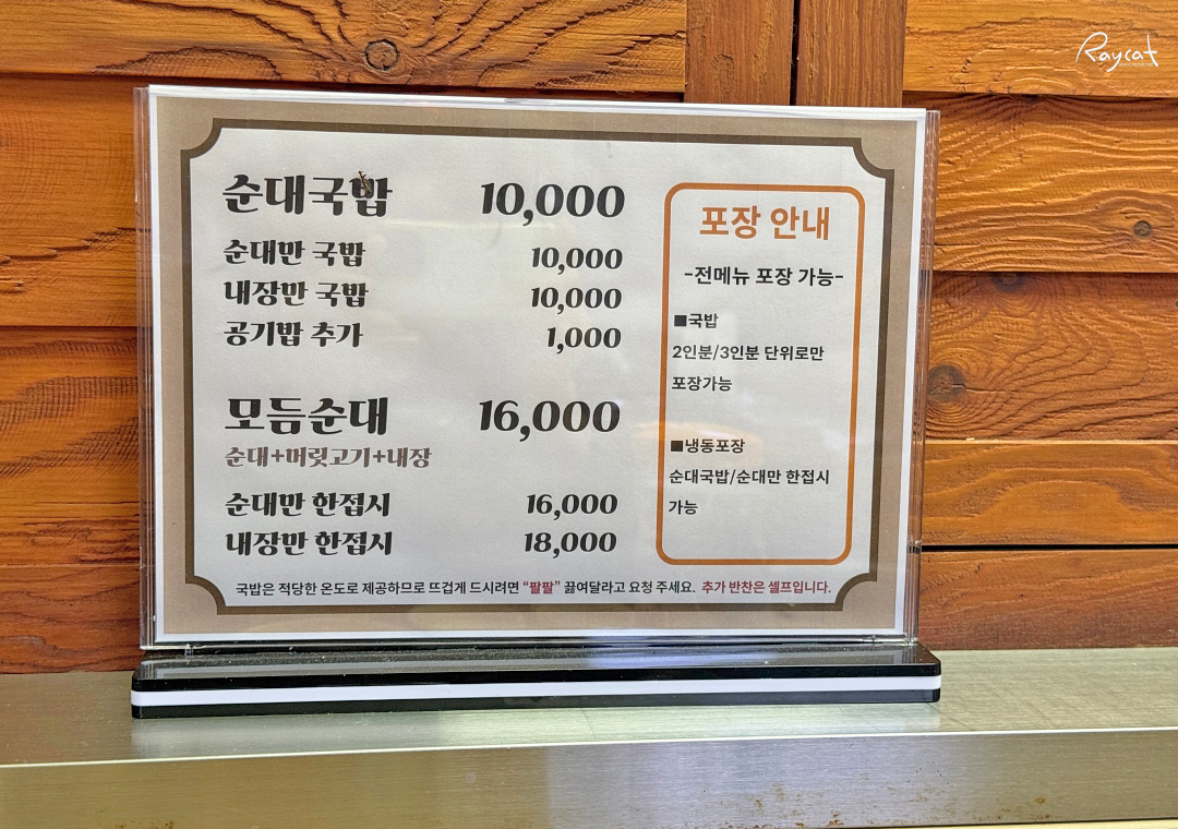 메뉴는 간단하게 메인으로 순대국밥, 모듬순대 이 두가지 뿐이며 음료수나 술을 주문할 수 있으며 국밥을 주문할 때 내장을 싫어하는 사람은순대만 혹은 내장을 좋아하는 사람은 순대를 빼고 내장만 넣어서 선택이 가능하다.