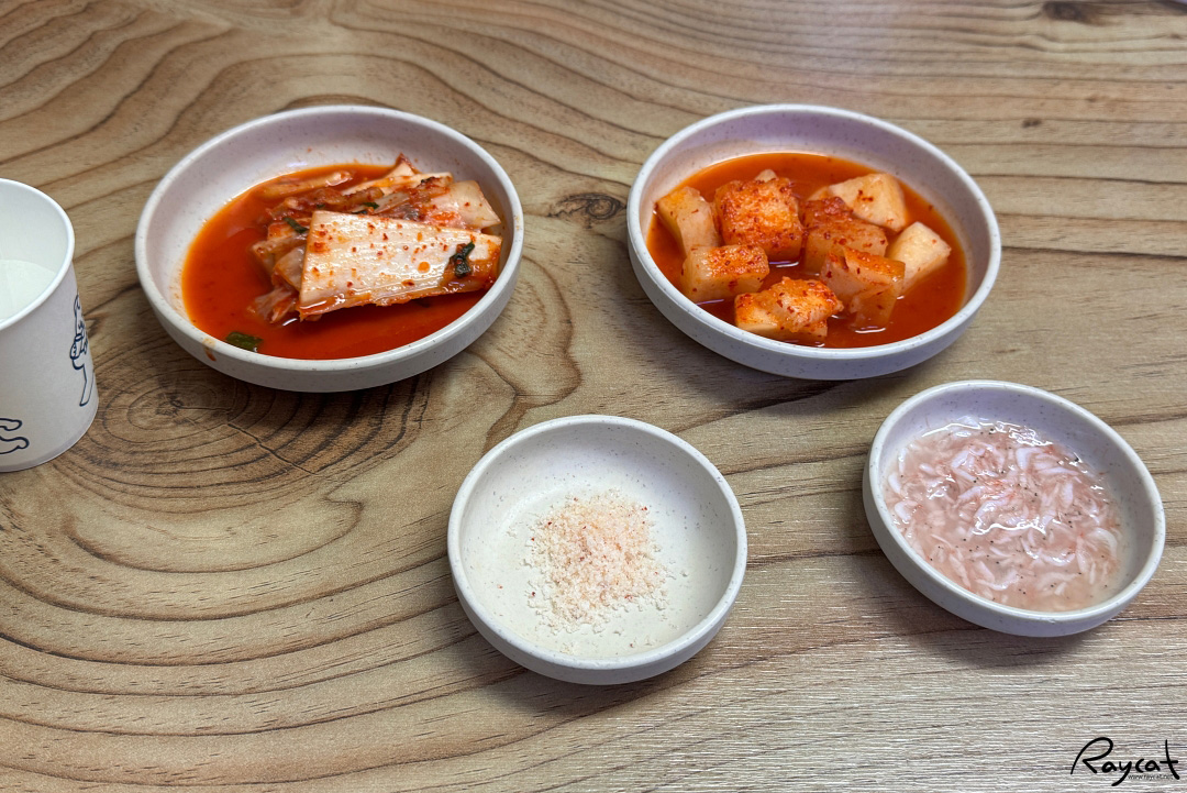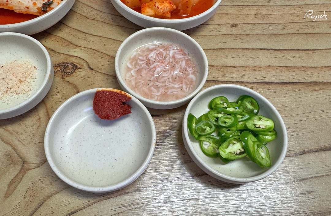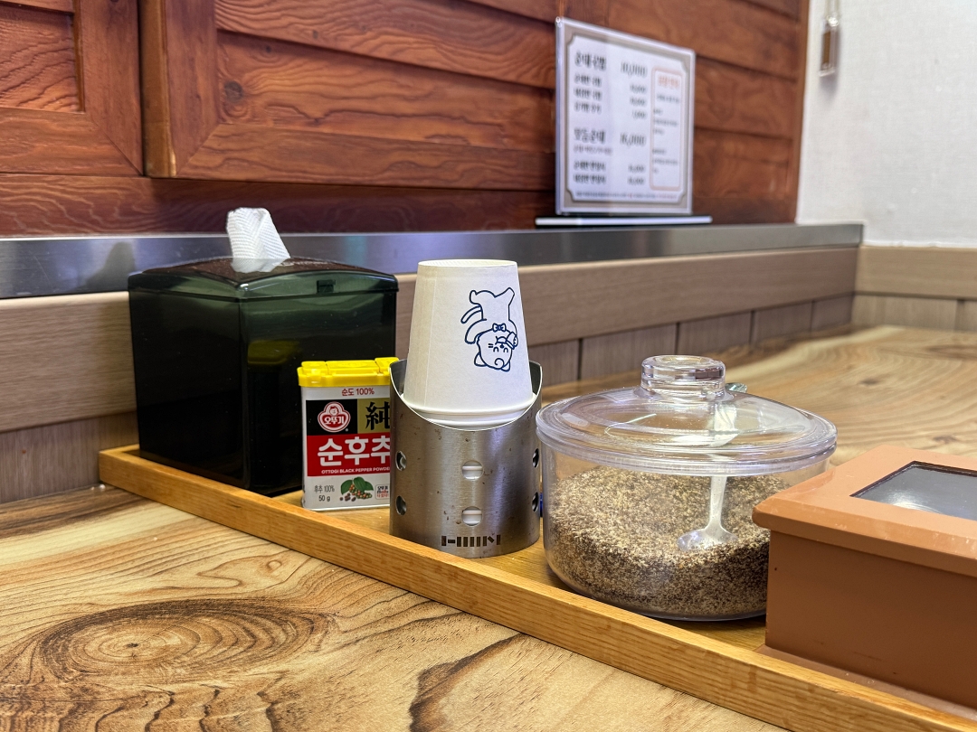 테이블에 앉으면 바로 물과 함께 김치, 깍두기, 소금, 새우젓을 가져다주고 테이블에 후추와 들깨가 있다.