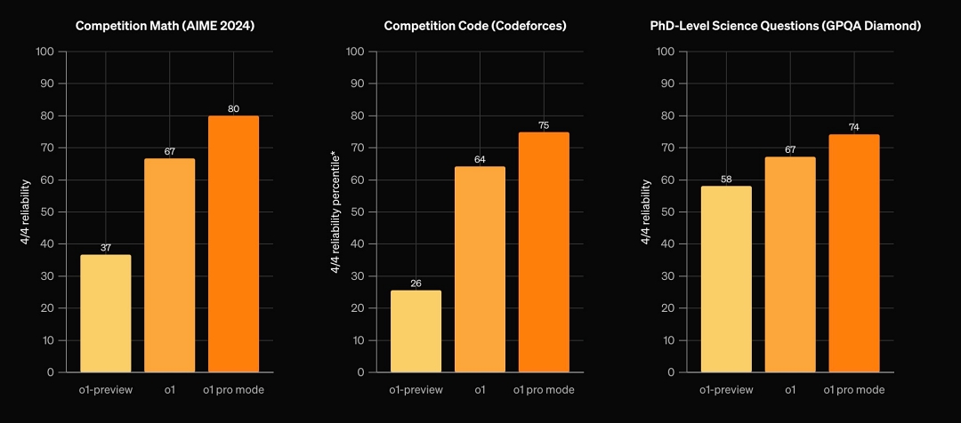o1 pro 모드의 주요 장점은 더 향상된 신뢰성을 강조하기 위해 문제를 해결했다고 인정받기 위해 한 번이 아닌 네 번의 평가에서 모두 정확한 답변을 제공해야 합니다. 단 한 번의 검증 결과로 그 결과가 맞다고 판단하지 않습니다.