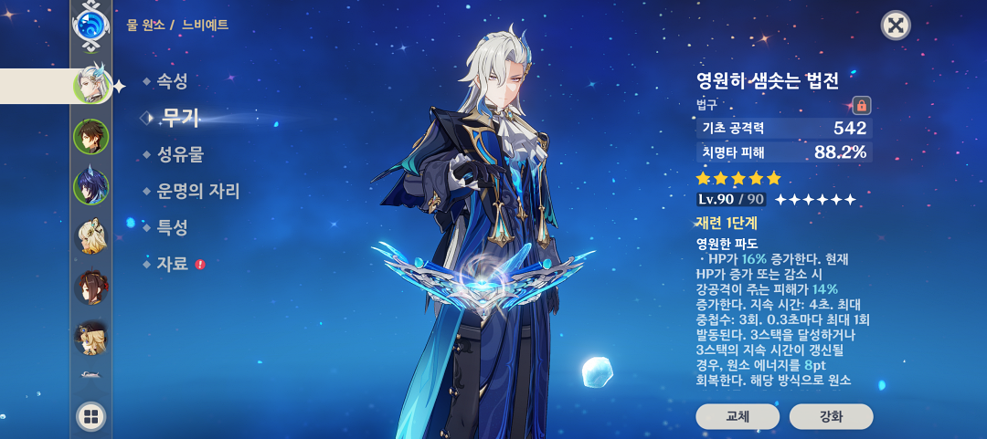 느비예트 무기의 경우 두말할 것 없이 전용무기인 '영원히 샘솟는 법전'이 가장 좋지만 다른 대안은 4성 무기로 '제사의 옥', '황금 호박 프로토타입', '푸른 문양 뿔잔'인데 개인적으로 모두 쓰보니 전용무기를 제외하면 '제사의 옥'이 가장 좋다고 봅니다.