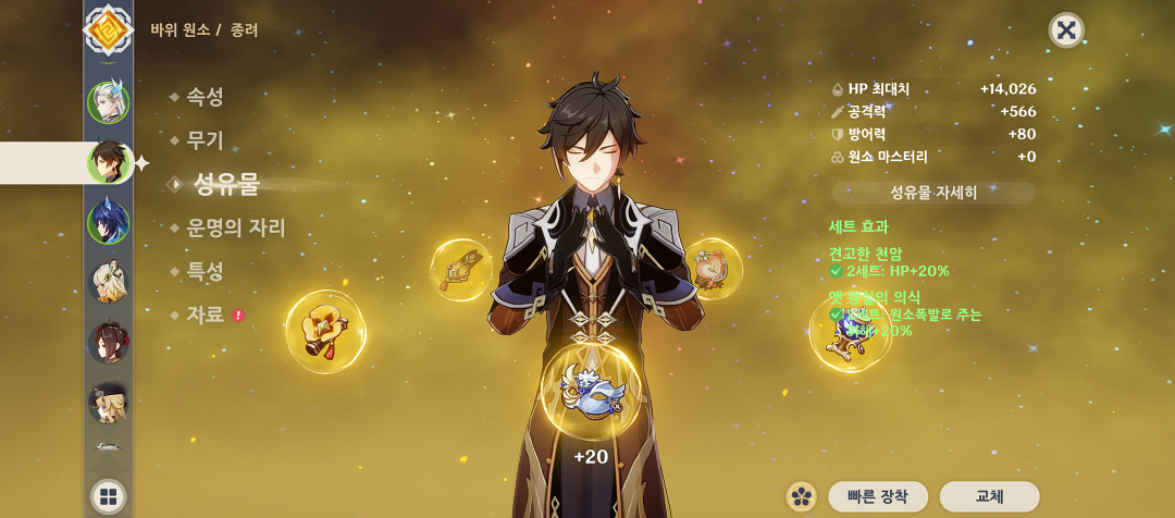 보호막 위주면 성유물 세팅도 투구, 성배, 시계 모두 주옵을 HP로 맞추고 치확이나 치피는 크게 신경 쓰지 않아도 됩니다.