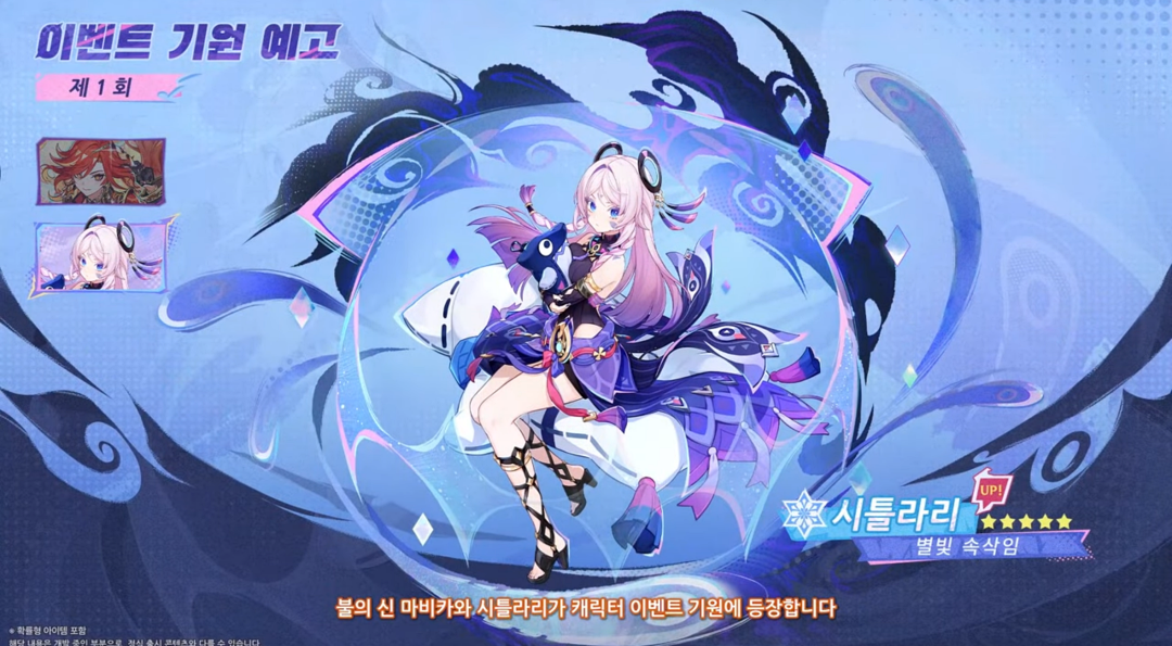 먼저 5.3 전반부 픽업은 불의 신 '마비카'와 '시틀라리'로 마비카는 메인 딜러이며 '시틀라리'는 얼음 서포터의 역할이며 나타 캐릭터의 경우 모두 특이한 이동기를 가지고 있는데 오토바이와 인형 쿠션을 타고 다닙니다.
