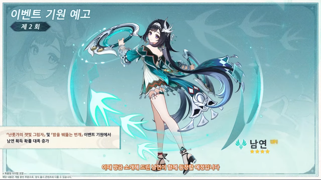 그리고 신규 4성 캐릭터 바람원소 '남연'이 후반부 픽업에 등장합니다. 남연의 경우 침옥협곡 출신으로 보호막을 만드는 서포터 포지션의 4성 바람 원소 캐릭터입니다.
