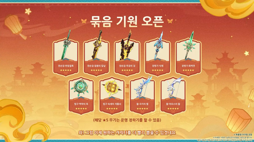 무기 역시 묶음 기원에 다시 등장하며 묶음 기원의 확률도 한정 픽업과 같은 확률로 픽업할 수 있습니다.