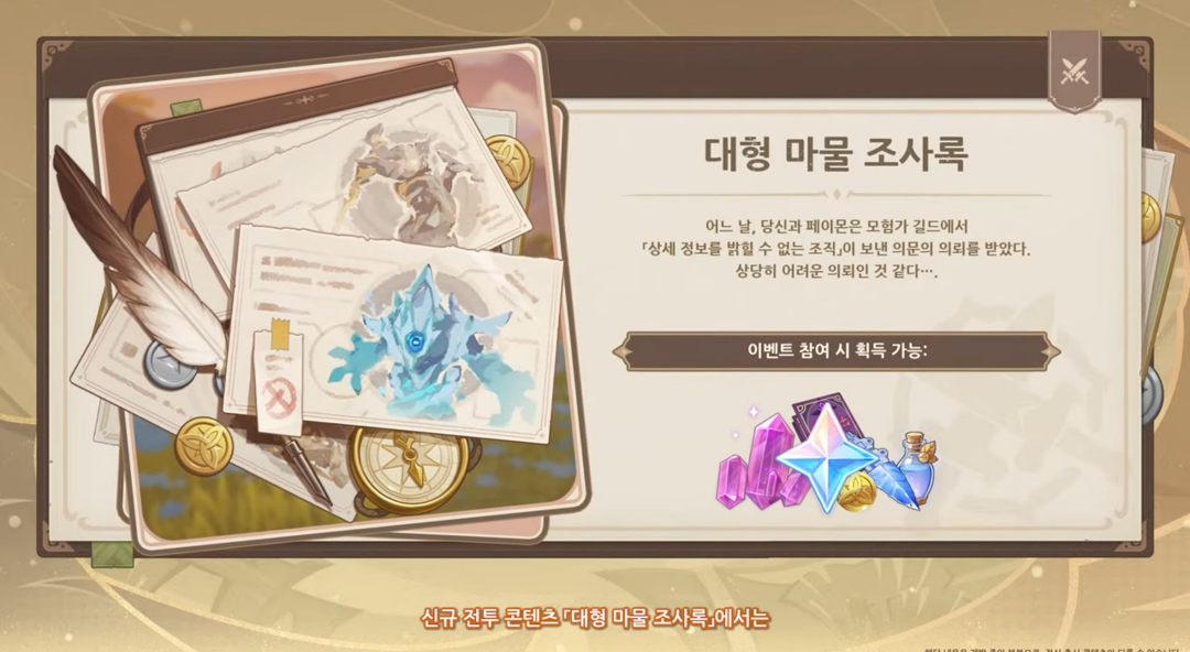 그리고 신규 전투형 콘텐츠로 '대형 마물 조사록'이 열리며 난이도가 상당히 어렵다고 방송에서 이야기를 하고 있습니다.