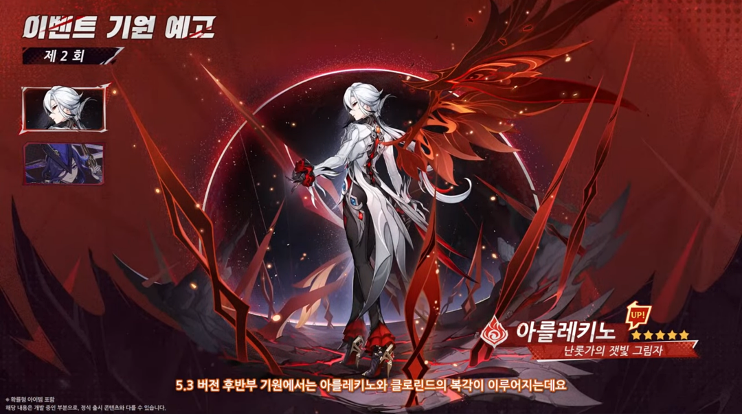 후반부 픽업은 '아를레키노'와 '클로린드'로 둘 다 메인딜러 캐릭터이며 제 경우 두 캐릭터 모두 보유 중이라 5.3 버전에서 후반부는 쉬어가게 될 것 같습니다.