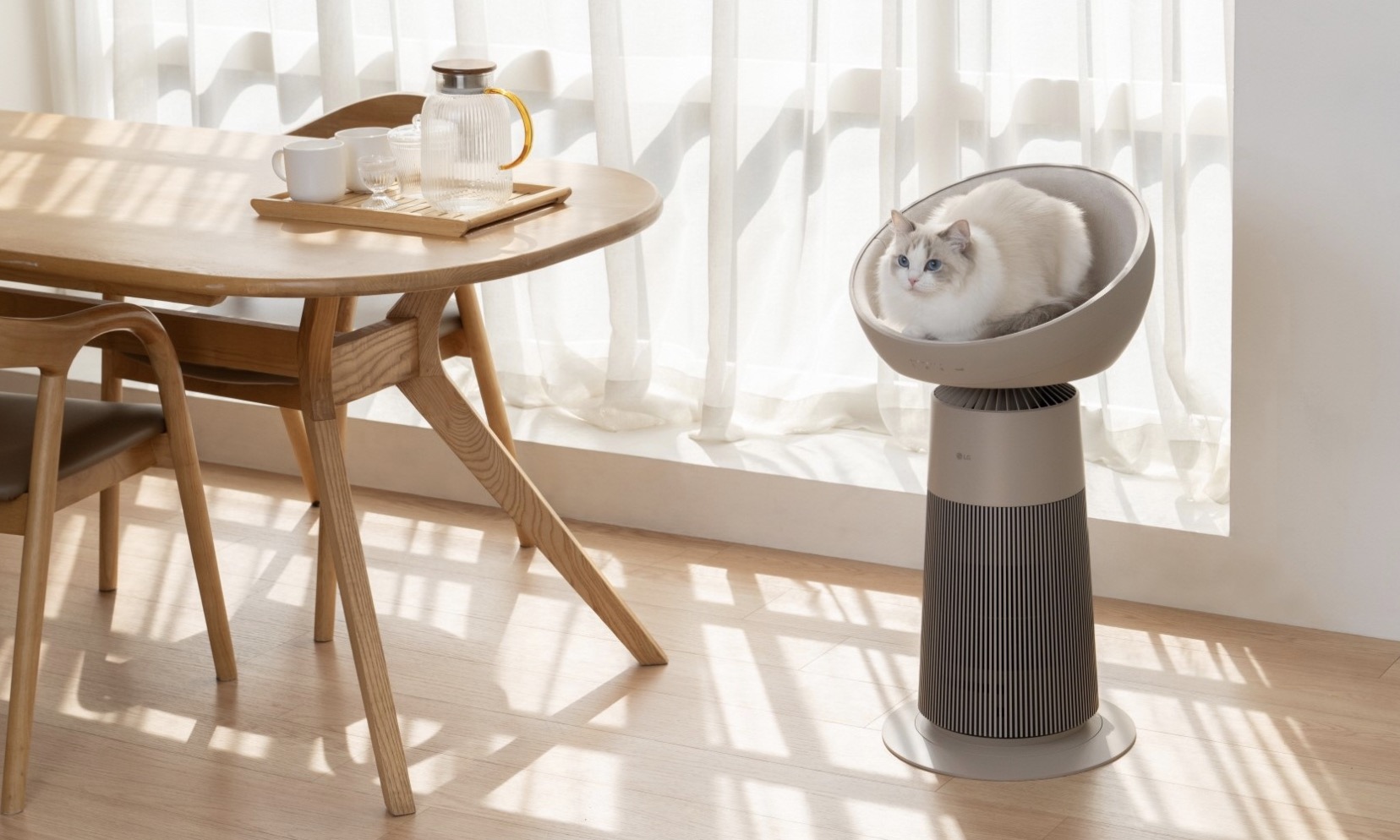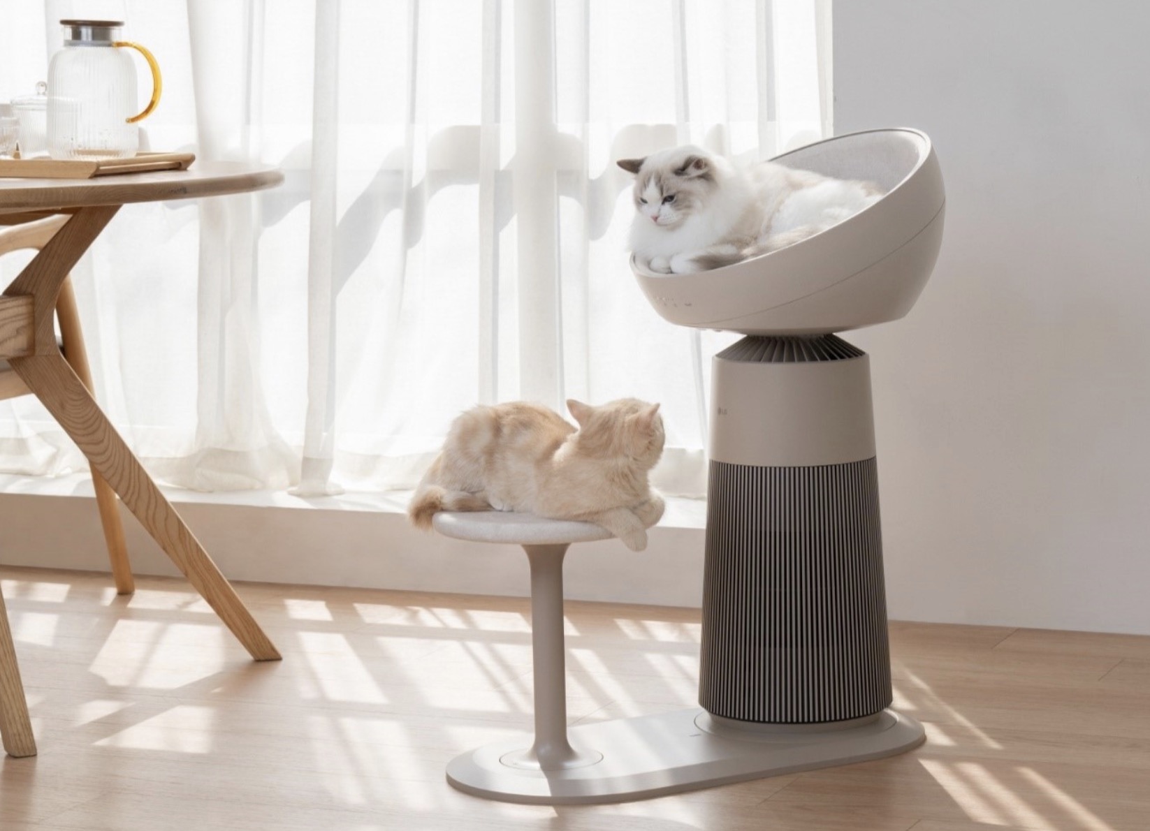 LG 공기청정기 ‘에어로’ 시리즈 중 하나인 ‘에어로 캣’은 고양이가 안정감을 느끼며 쉴 수 있도록 돔형 좌석을 추가한 공기청정기로 고양이의 편안한 휴식을 위한 다양한 기능을 갖췄습니다.
