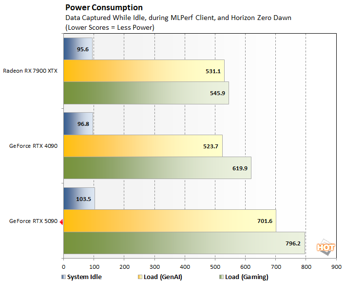 아래 전력 수치는 MLPerf 클라이언트 및 호라이즌 제로 던 리마스터 테스트 중에 캡처한 것이며 GPU 자체가 아니라 총 시스템 전력 소비를 측정한 것이니 참고해서 보시면 될 것 같습니다.