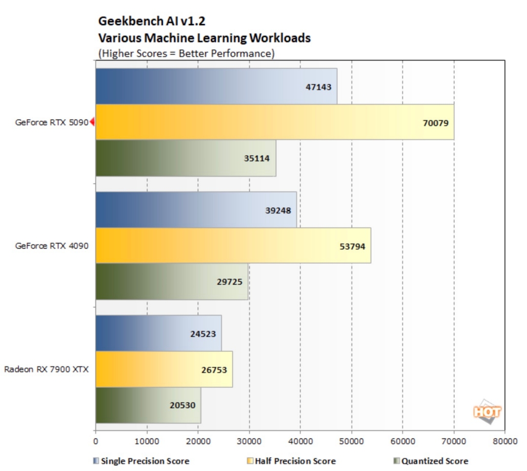 이번 벤치마크의 결과를 보면 GeForce RTX 5090의 테스트 항목은 AI, 3D 렌더링 및 크리에이터 워크로드이며 이전 모델과 비교한 결과입니다.