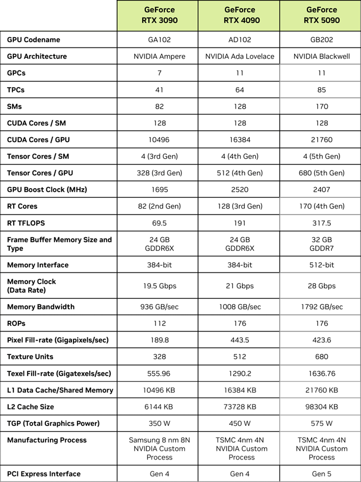 벤치마크 테스트에 사용된 RTX 5090의 스펙은 위 이미지에서 확인할 수 있으며 이전 모델과 비교해 볼 수 있습니다.