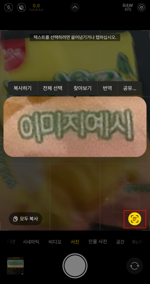 사진 촬영중 문자를 인식하면 아래쪽에 텍스트 인식 아이콘이 나오며 저 아이콘을 터치하면 분리된 텍스트를 선택하면 텍스트만 복사하거나 선택해서 검색, 공유, 번역이 가능합니다.