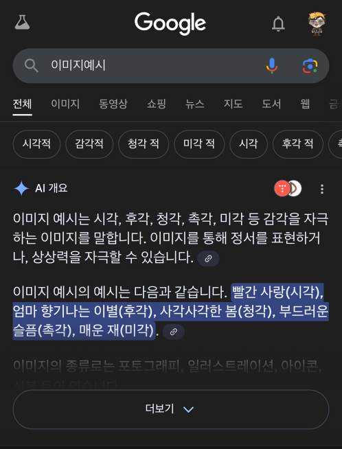 아이폰 카메라에 인식된 '이미지예시'란 텍스트를 검색해 보면 AI 검색의 예시를 보여주며 그 뜻을 알려줍니다.