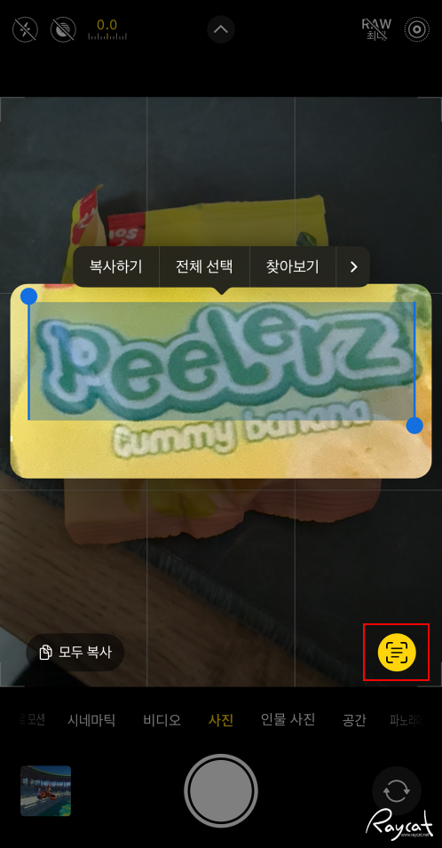 사진 촬영중 문자를 인식하면 아래쪽에 텍스트 인식 아이콘이 나오며 저 아이콘을 터치하면 분리된 텍스트를 선택하면 텍스트만 복사하거나 선택해서 검색, 공유, 번역이 가능합니다.