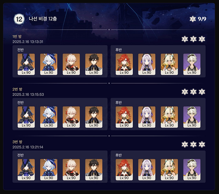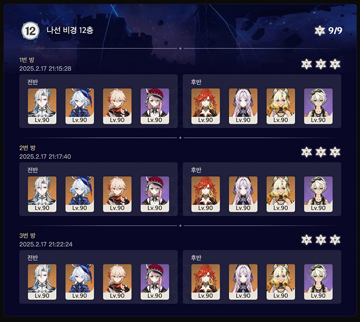 아래는 제가 클리어한 5.4 버전 나선비경 12층 파티조합입니다.
