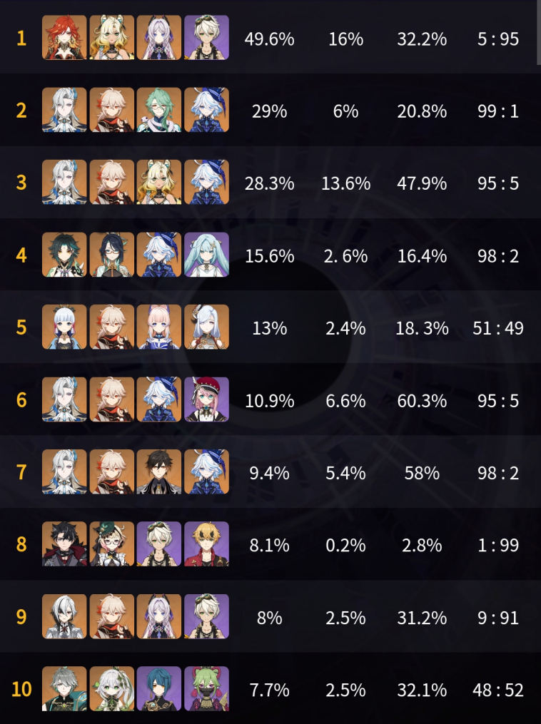 나타 캐릭터들 그리고 폰타인에서 생계를 사용하며 자힐이 가능한 캐릭터들의 픽률이 올랐는데 힐러들도 중간중간 눈에 들어옵니다.