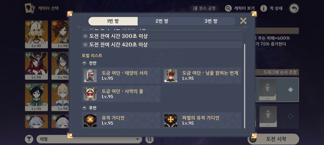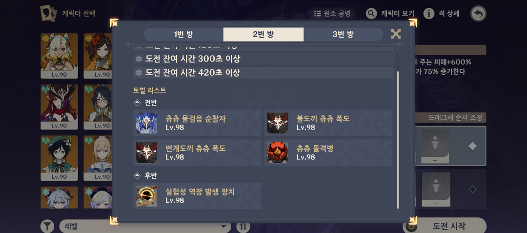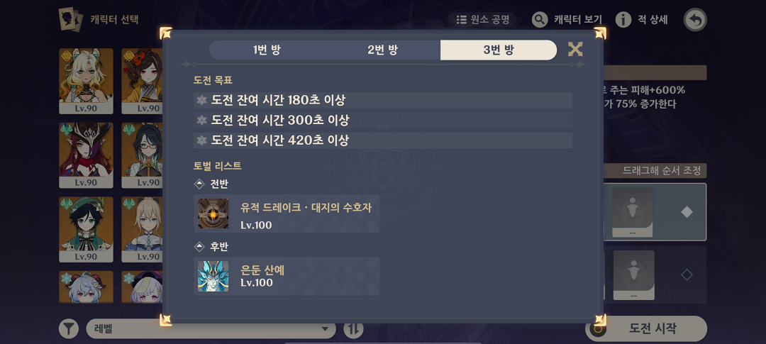 후반부는 지금 원신에서 가장 고점이 높은 파티가 아닐까 싶은데 '마시실베'로 전후반 모두 무난하게 클리어 가능합니다.