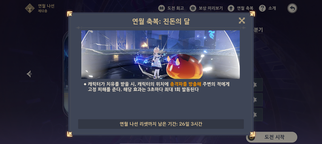 매월 16일이면 나선비경의 몹 배치가 리셋되며 버프도 바뀌고 12층까지 클리어하면 보상을 받습니다.