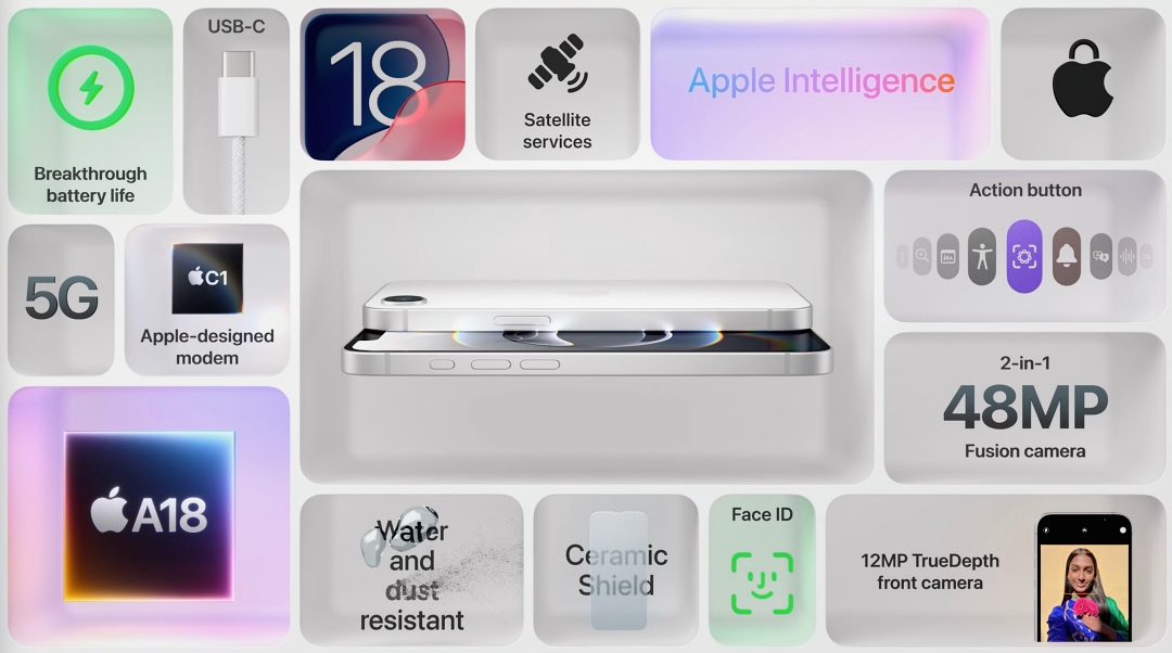 인포그래픽을 보면서 주요 특징을 보면 AP는 A18, 애플 인텔리전스를 지원하며 USB-C 포트를 사용하며 국내에 해당사항이 없지만 위성 통신 서비스 이용이 가능하며 액션 버튼은 있지만 카메라 컨트롤 버튼은 없습니다.
